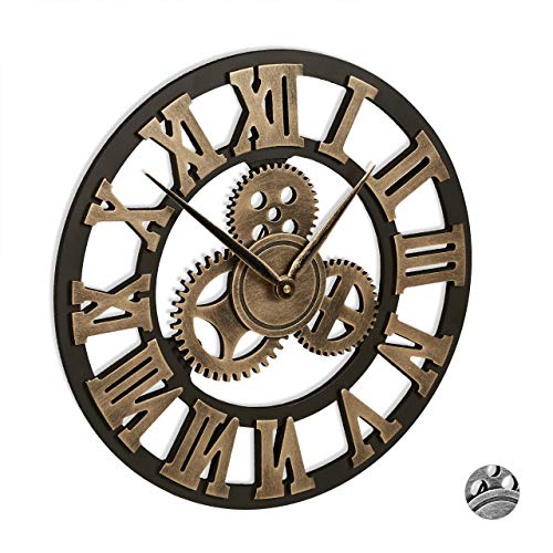 Relaxdays Växel väggklocka, inget tickande ljud, romerska siffror, vintage, 3D, kugghjul, industriell, Ø 40 cm, gyllene, MDF-skivor, järn, 1-pack