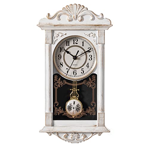 Quickway Import vintage farfar trä – snygg plastpendel väggklocka för vardagsrum, kök eller matsal, vit