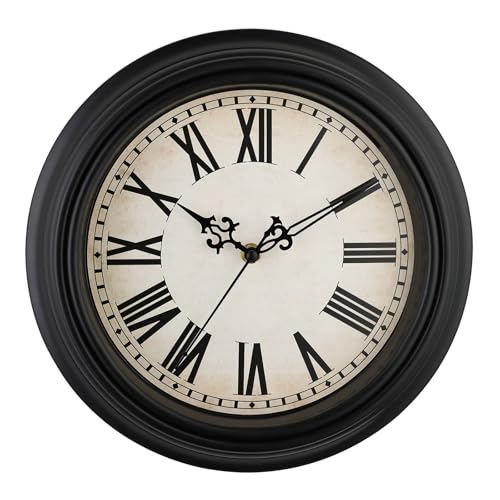 Plumeet klassisk retro väggklocka 25 cm – tyst utan tickande ljud för vardagsrum, sovrum – med romerska siffror, svart