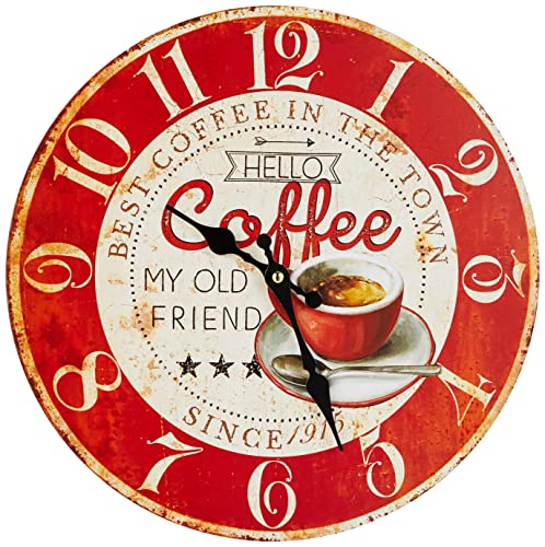 TFA Dostmann väggklocka analog vintage, 60.3045.12, kaffemotiv, stora siffror, lättläst, röd