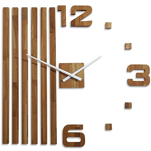 FLEXISTYLE Gör-det-själv 3D-väggklocka, ekträ, lameller, stor 3D-väggklocka, modern design, EKO, dekoration för kontor, vardagsrum, sovrum, dekoration (svart, vita visare)