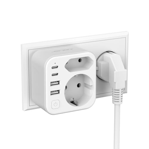 JSVER 2-Vägs Uttag Plugg med 2 USB A-portar, 2 USB C-portar (3,4A/5V), 6-i-1 Multipeluttag Väggkontakt, Kompakt Vägguttag med Strömbrytare för Resor - Vit Doppelstecker för iPad iPhone Surfplattor