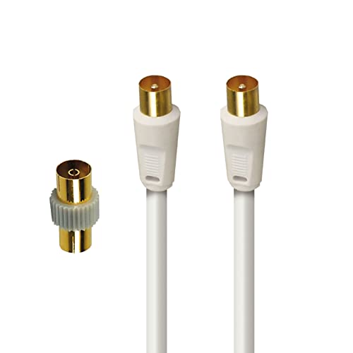 apm 9,52 mm antenn TV-kabel, 2 meter, guldhane/hankontakter, vit koaxialkabel med hona/hona adapter ingår, kompatibel med TV-dekoder TNT väggkontakt 9,52 mm, 408014
