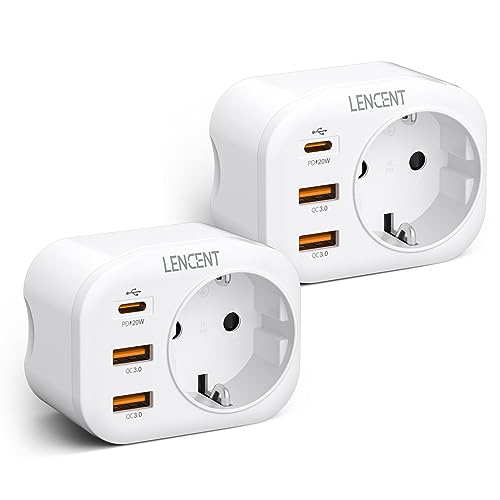 LENCENT EU Uttag Plugg med 3 USB Snabbladdning, 4-i-1 Multikontakt Grenuttag med 1 PD 20W Type-C & 2 QC USB-A 3.0 Snabbladdningsportar, Multipeluttag Väggkontakt för Hem Kontors Resor, Type C/E/F