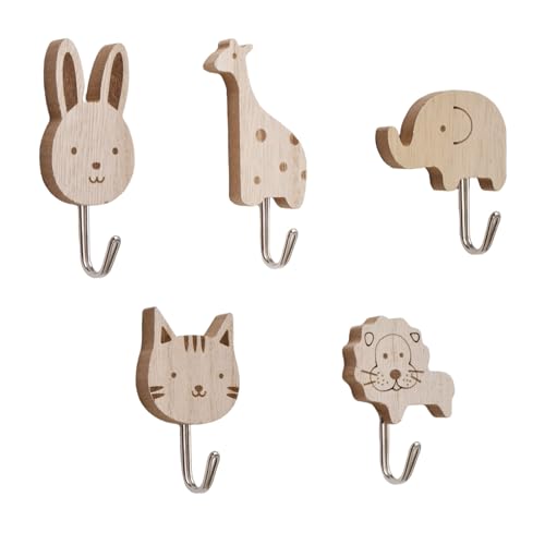 RUNEAY Garderobskrokar barn 5 stycken, klädkrokar barn roliga djurkrokar självhäftande, trä barngarderob utan borrning, väggkrok, barnkläder för barnrum, babyrum, dekoration