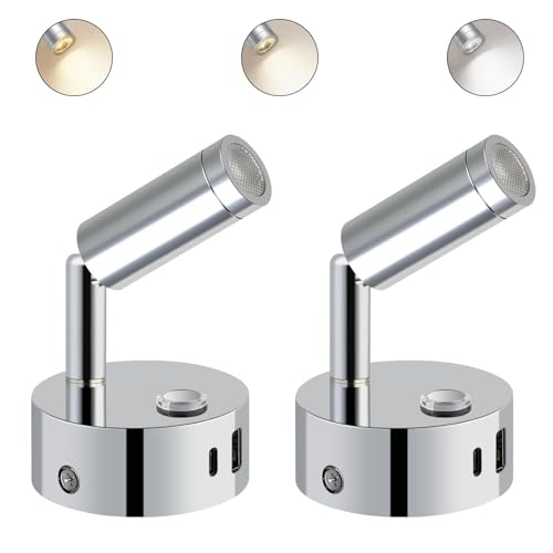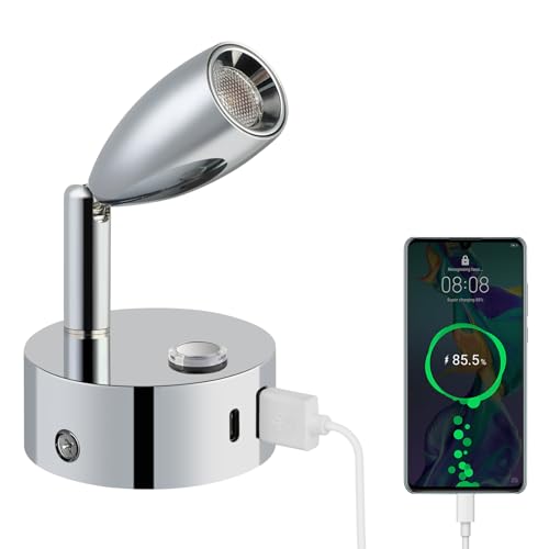 ERWEY LED-läslampa 12V husbil touchdimbar 3 färgtemperaturlägen, vägglampa med laddningsfunktion USB A+C-anslutningar, DC 12V-24V spotbelysning för båt bil husbil van yacht, silver