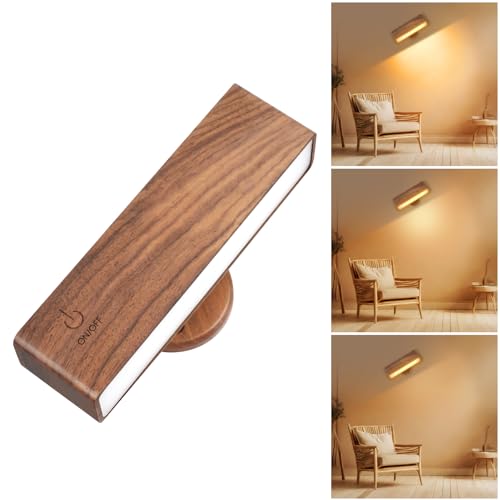 HOTUT Vägglampor i trä, inomhusvägglampa 360° roterbar, magnetisk 4 000 mAh agnetisk vägglampa med USB-laddning, pekkontroll, justering av ljusstyrka för sovrum, vardagsrum