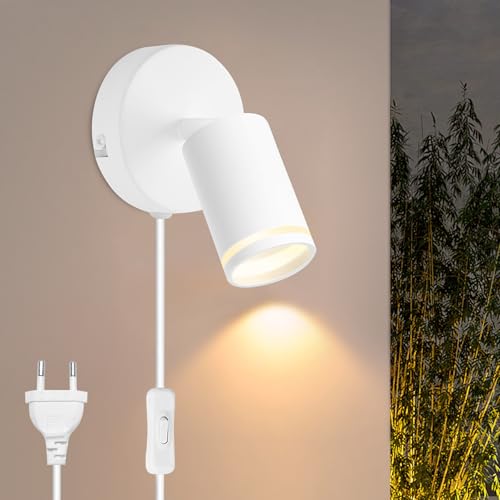 BOYIR Vägglampa med strömbrytare och uttag - vit inomhusvägglampa - modern vägglampa med kabel, GU10 vridbar spotlight, 350° vägglampa för sovrum, hall, utan glödlampa
