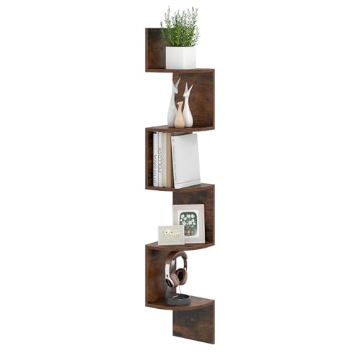 COSTWAY 5 våningar hörnhylla, hängande svävande bokhylla, väggmonterad svävande hylla, förvaringsutrymmesorganisatör trä, utställningsstativ för vardagsrum, sovrum, 20 x 20 x 126 cm (brun)