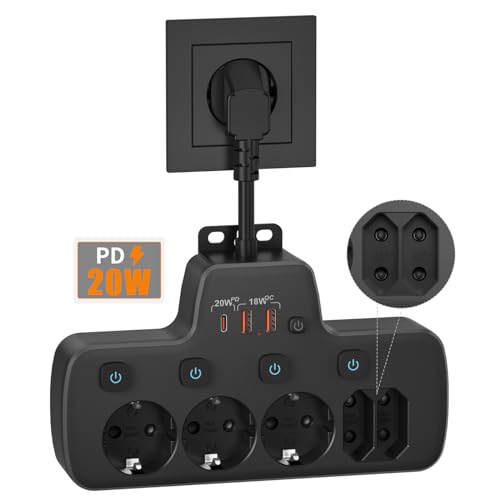 PD20W Grenuttag 5 Uttag, USB Eluttag 5-Vägs Multikontakt, Power Strip USB med PD20W och QC18W Snabbladdning, Flera Uttag Överspänningsskydd, Uttagslist med Strömbrytare,Vägguttag Väggmonterad, Svart