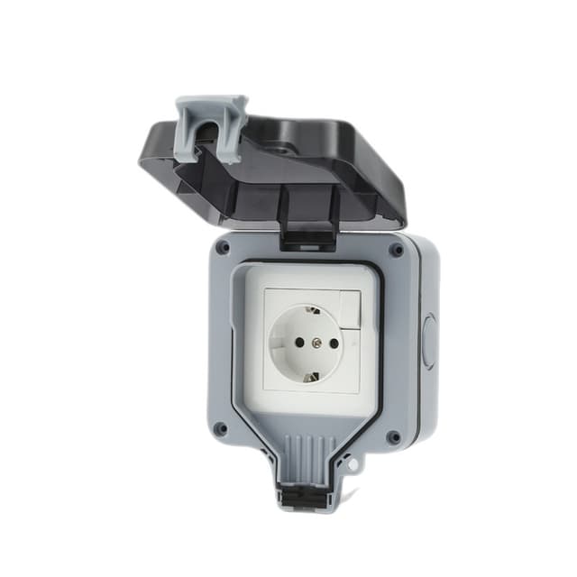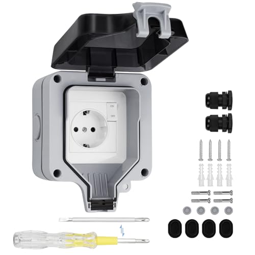 Utomhusuttag, IP66, vattentätt uttag med strömbrytare, indikatorlampa, vägguttag, våtrum, ytmonterat, skyddskontakt, trädgårdsuttag, dammtätt, väderbeständigt utomhusuttag med gångjärnslock