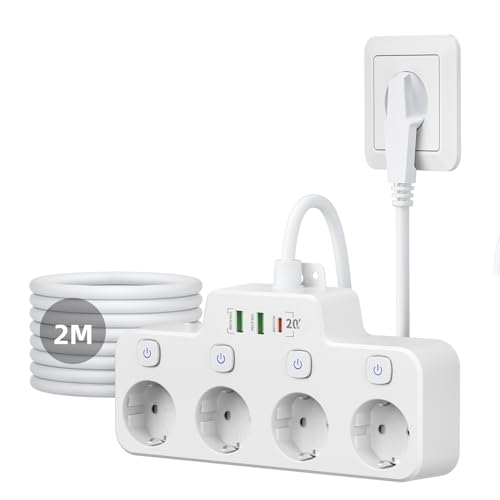 Grenuttag med USB C PD 20 W, Grenuttag med individuellt Strömbrytare med platt plugg, 4-Vägs USB-uttag Multiuttag med 4 strömbrytare, Multipeluttag Vägguttag för kök vardagsrum 2 m kabel, vit