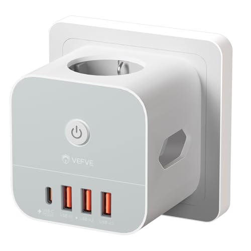VEFVE USB C PD vägguttag 20 W - USB-uttag, 7-i-1 multikontakt kub med strömbrytare, 1 USB-C-port, 3 USB-A-portar och 3 uttag, 3 680 W - perfekt för hem och kontor