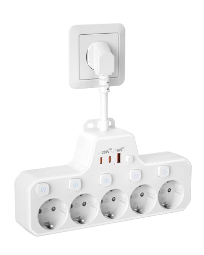 Grenuttag med Strömbrytare,Uttagslist 5-vägs Multikontakt Uttag,Flera Uttag Strömlist med överspänningsskydd Vägguttag PD20W Snabbladdning Grenuttag Väggmontering Kort Kabel 0,1M för Kök Kontor,Vit