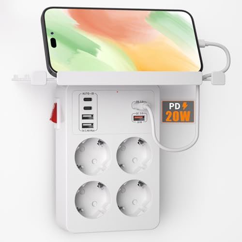 PD20W USB Uttag med Strömbrytare, Grenuttag med PD3.0 och QC18W snabbladdning,Vägguttag med 4 EU Eluttag och 6 USB Laddare,Uttagsadapter 1 Hylla,Väggladdare Flera Uttag med multikontakt Schuko,Vit