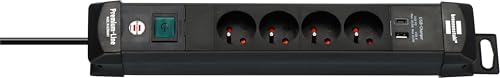 Brennenstuhl Premium-Line grenuttag med 4 uttag och 2 x USB C PD, 65 W och USB A 18 W (tillverkad i Tyskland, grenuttag med 3 m kabel och strömbrytare, vägguttag) svart
