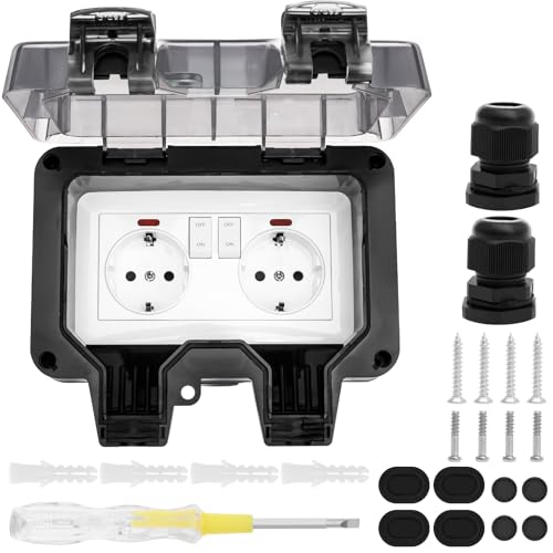 Miiepls Externt vägguttag, väderbeständigt, IP66, med strömbrytare, kontrollindikator, 2 fack, 16 A, trädgårdsuttag med fällbart lock för utomhusbruk