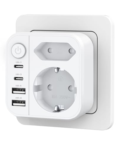 JSVER 2-Vägs Uttag Plugg med 2 USB A-portar, 2 USB C-portar (3,4A/5V), 6-i-1 Multipeluttag Väggkontakt, Kompakt Vägguttag med Strömbrytare för Resor - Vit Doppelstecker för iPad iPhone Surfplattor