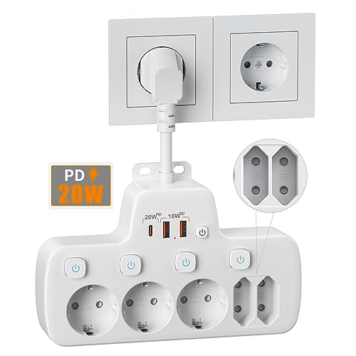 Vägguttag med USB C, 3-vägs Grenuttag med Strömbrytare,PD20W Uppsättning Multikontakt Väggmontering,Uttagsadapter med Barnsäkring,Eluttag Flera Uttag med överspänningsskydd,Kontakt Skyddskontakt,Vit
