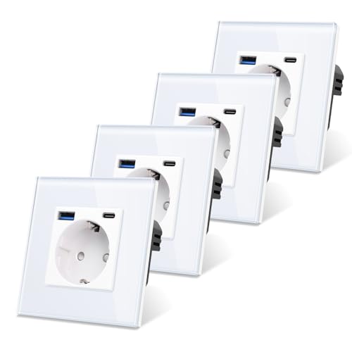 CNBINGO Glasvägguttag, 4-pack med USB-portar (typ C och typ A, totalt 3,1 Amp) – designat vägguttag med skyddskontakt, enkelt vägguttag med glasram – USB-uttag infällt, vitt