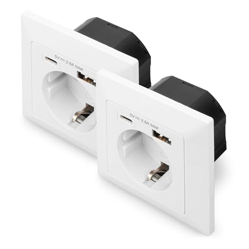 DIGITUS DA-70615 - Infällt vägguttag med USB-laddare - 2 styck - 1x USB-A upp till 2,8 A / 1x USB-C upp till 2,8 A - Installationsdjup 32 mm - Villkorligt designkompatibel - Ren vit RAL 9003