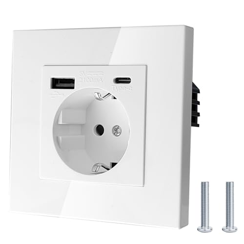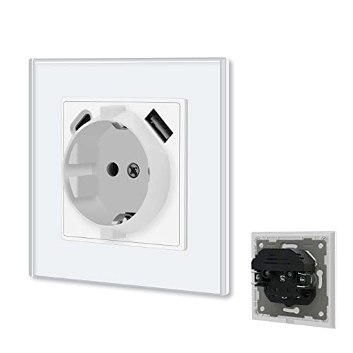 BSEED Jordat vägguttag med USB (max. 2,1 A), USB C-port, infällt uttag, vitt glas, skyddskontaktuttag, perfekt för laddning av mobiltelefoner, bärbara datorer med mera