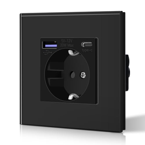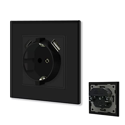 BSEED Schuko Vägguttag med 20 W USB & typ C snabbladdare, glas, 3-i-1 inbyggda uttag, laddningskapacitet och USB C-adapter, laddningsstation, enkel installation, svart