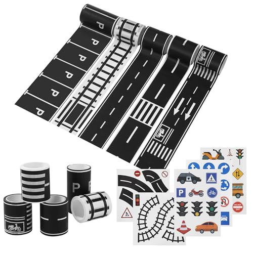 12 stycken vägar washi tejp, 4 rullar väg motorväg järnväg gator tejp (5 cm x 5 m), 1 rulle parkeringstejp (7,5 cm x 3 m) och 5 trafikmärken klistermärken, motorväg självhäftande vägtejp