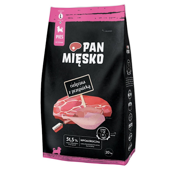 Torrfoder för hundar PAN MĘSKO Kalvkött med vaktel L 20kg