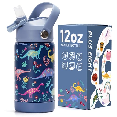 pluseight Isolerad vattenflaska för barn med sugrörslock, 35 ml BPA-fri dubbelvägg vakuumbehållare 18/8 rostfritt stål läckagesäker barnkoppar med sugrör för skola resor pojkar flickor (dinosaurie)