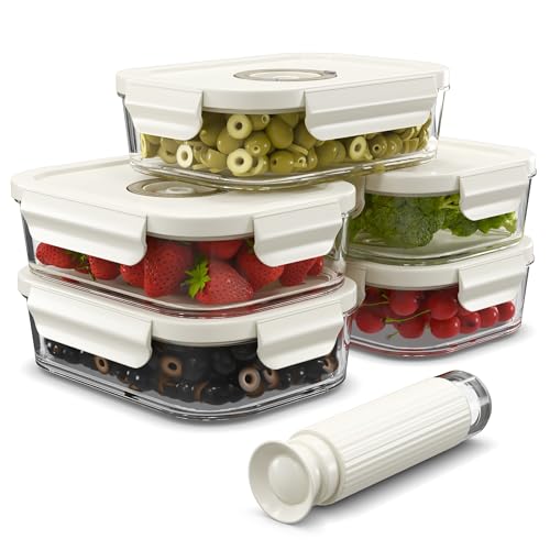 Unikt tryck 5-pack 1 040 ml glasvakuum matförvaringsbehållare med datumspårare och pump – lufttäta vakuumbehållare med lock – säker för ugn, mikrovågsugn och kyl/frys – läckagesäker