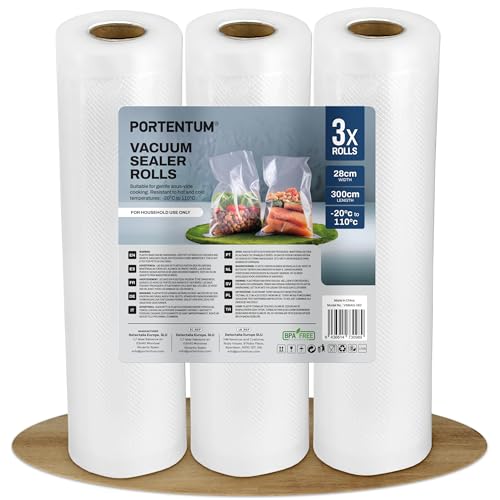 PORTENTUM Tomma matpåsar – 3 rullar vakuumförpackare på 28 cm, total längd 900 cm – påsar för vakuumförpackning av livsmedel. LFGB och BPA Free Certified