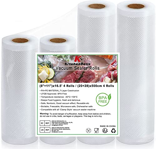 KitchenBoss Tomma Väskor Mat Rullar Vakuumbehållare:Påsar Töm Förpackning Mat För Vakuumförpackning, Sous Vide Kök Vakuumförpackningar Väskor 4 Rullar 20x2/28x2/500cm