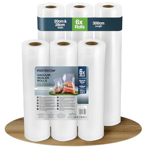 PORTENTUM Tomma matpåsar – 6 rullar vakuumförpackare på 20 cm och 3 x 28 cm. Total längd 1800 cm. Påsar vakuumförpackning mat. Certifierad LFGB och BPA Free
