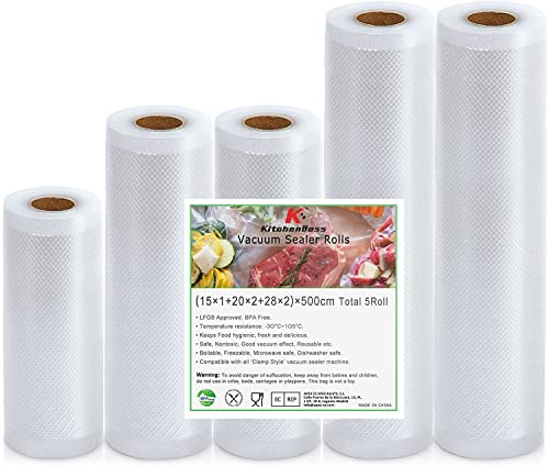 KitchenBoss Vakuumväska: BPA-fri matvakuumrulle för vakuummaskin, 5 rullar, vakuumfolie för mat vakuumförpackning, 15/20 x 2/28 x 2/500 cm