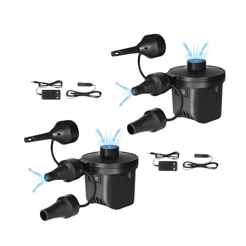 2x Elektrisk Luftpump för Simbassänger. Inflator - Bärbar Madrassdeflator. Uppblåsare för Madrasser, Flottörer, Vakuumförpackning, med 3 Munstycken. Kompressor 240V AC / 12V DC.