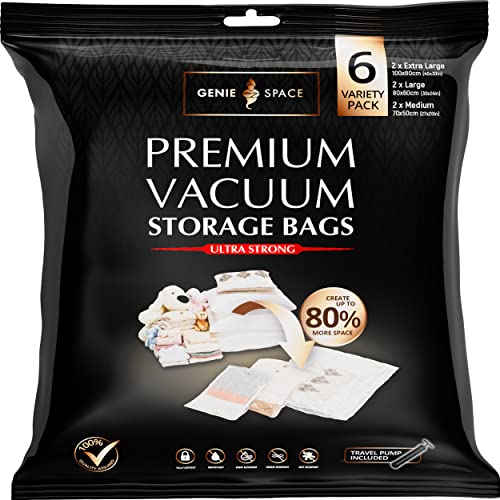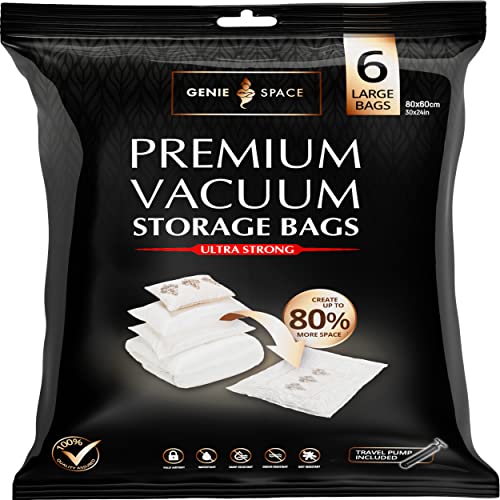 GENIE SPACE Premium Vakuumpåsar för Kläder, Täcken & Sängkläder – 6 x Stor (80×60 cm) med Handpump, Lufttäta, Återanvändbara & Luktfria Förvaringspåsar som Sparar upp till 80% Utrymme