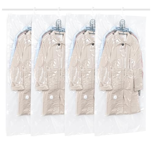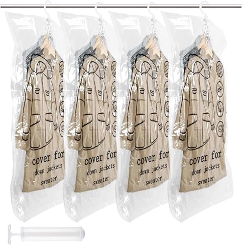 Vakuumpåsar för kläder, 4 stycken hängande vakuumpåsar, 110 x 70 cm, vakuumpåsar för kläder med pump för kostymer, rockar, jackor