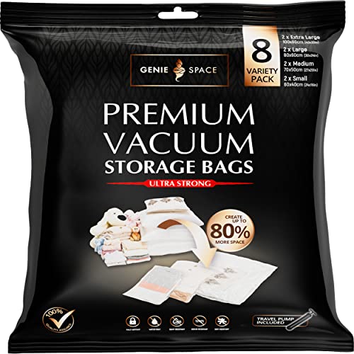 GENIE SPACE - Otroligt Bra Premium Platsbesparande Vakuumpåsar | Variation 8-Pack (2XL+2L+2M+2S) | Lufttäta & Återanvändningsbara | Spara utrymme | Vakuumpåsar för Kläder, Handdukar, Sängkläder,Täcken