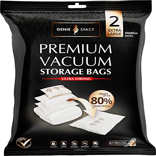 GENIE SPACE Premium Vakuumpåsar för Kläder, Täcken & Sängkläder – 2 x Extra Stor (100×80 cm), Lufttäta, Återanvändbara & Luktfria Förvaringspåsar som Sparar upp till 80% Utrymme
