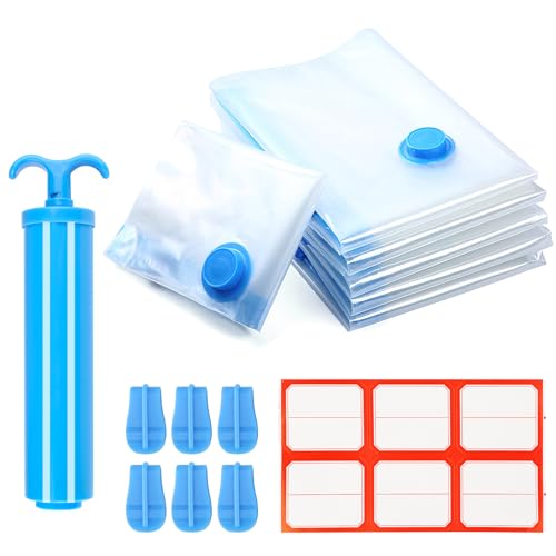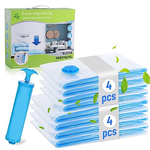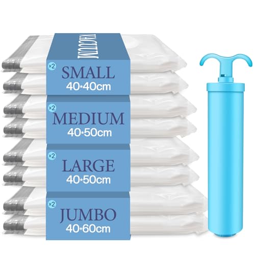 Vacbird Vakuumpåse för kläder med handpump, 8 stycken (2 Jumbo/2 stor/2 medel/2 liten), återanvändbara vakuumpåsar kläder lämpliga för resor, kuddar, sängkläder, flytt