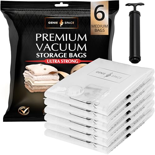 GENIE SPACE Premium Vakuumpåsar för Kläder, Handdukar & Sängkläder – 6 x Medium (70×50 cm) med Handpump, Lufttäta, Återanvändbara & Luktfria Förvaringspåsar som Sparar upp till 80% Utrymme