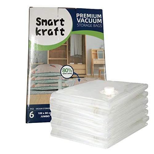 SMART KRAFT 6-pack 100 x 80 cm jumbo (extra stor) vakuumförvaringspåsar för kläder, täcken, sängkläder, noppor, resa med dubbla vakuumpåsar med dubbla vakuumpåsar för kläder