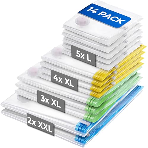 myHodo Vakuumpåsar 14-pack – 2 XXL (80x100cm), 3 XL (60x100cm), 4 XL (60x80cm), 5 L (50x60cm) – Platsbesparande vakuumpåsar för Kläder, Täcken & Sängkläder