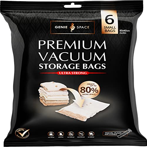 GENIE SPACE Premium Vakuumpåsar för Kläder, Handdukar & Resor – 6 x Små (60×40 cm) med Handpump, Lufttäta, Återanvändbara & Luktfria Förvaringspåsar som Sparar upp till 80% Utrymme