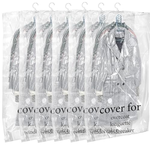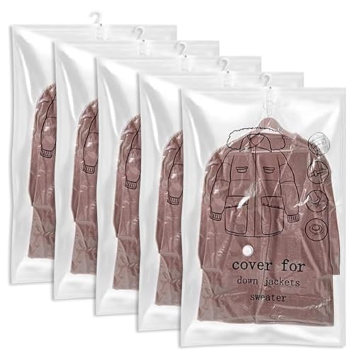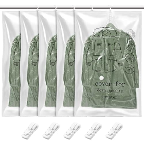 Hängande vakuumpåsar kläder, 5 stycken vakuum klädpåsar med klädkrokar, 110 x 70 cm transparenta vakuumpåsar för kläder för kostymer, rockar, jackor, klänningar och talare