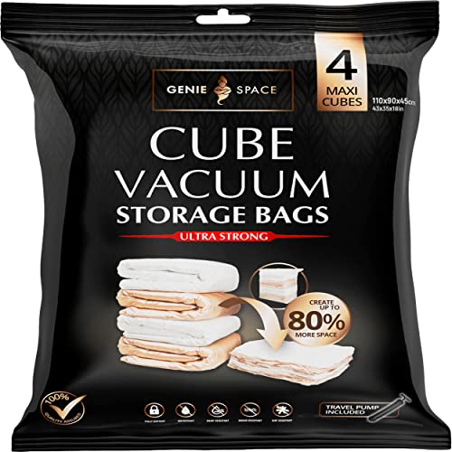 GENIE SPACE Vakuumpåsar - Otroligt Starka Premium Kubformade Vakuumpåsar för Kläder, Handdukar, Sängkläder, Täcken med mera | 4 x MAXI (110x90x45cm) | Lufttäta & Återanvändningsbara | 80% mer utrymme