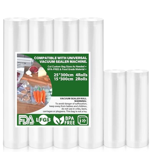 Vakuumpåsar 6 rullar Vakuumpuskar Mat 15|25x300cm, Vakuumfolie för alla Vakuumförpackare, Vakuumpåse BPA-fri, rivtålig, 190 µm, Sous Vide fryspåse för alla Mikrovågsugnar