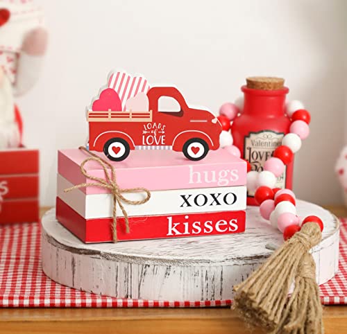 Alla hjärtans dag nivåindelad brickdekor, 1 alla hjärtans dag träbokstapel, 1 pärlgirlang för alla hjärtans dag, kram XOXO kyss mini falska dekorativa böcker bunt, bondgård alla hjärtans dag dekor för