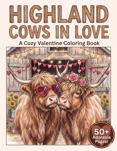 Cute Highland Cows Valentine Coloring Book: 50 Adorable Fluffy Scottish Cattle Illustrations with Hearts, Flowers & Farmhouse Vibes for Kids, Teens & Adults